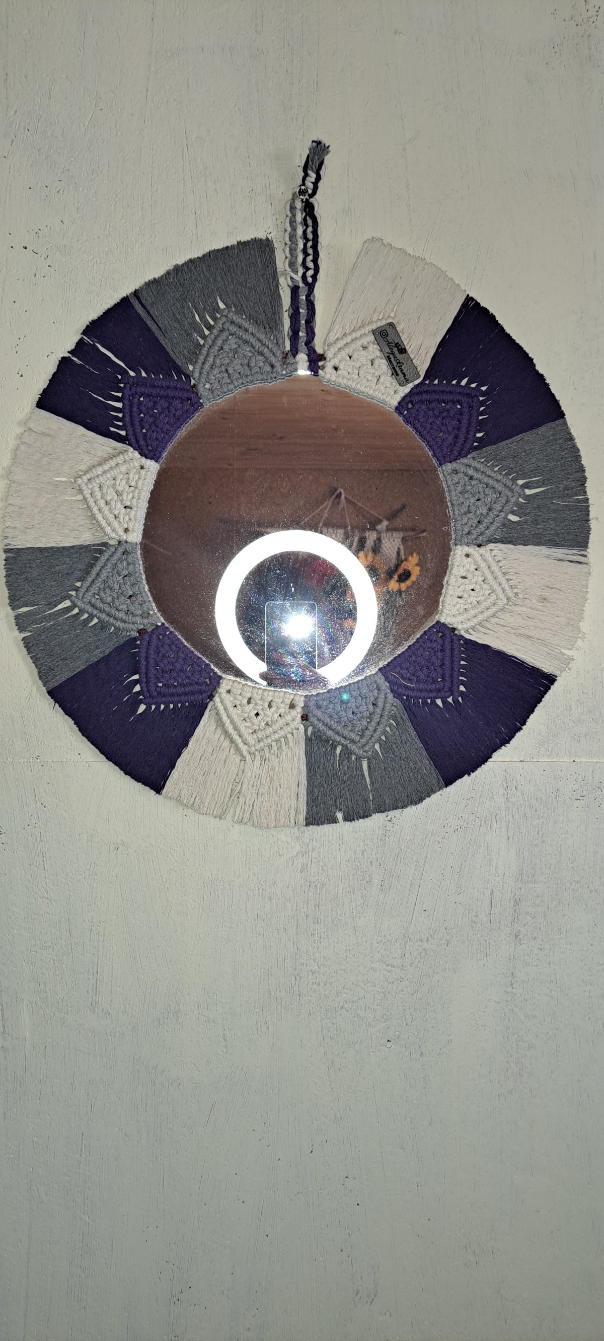 Hermoso espejo tejido con borde de nudo triangulo con las orillas secas en cola,