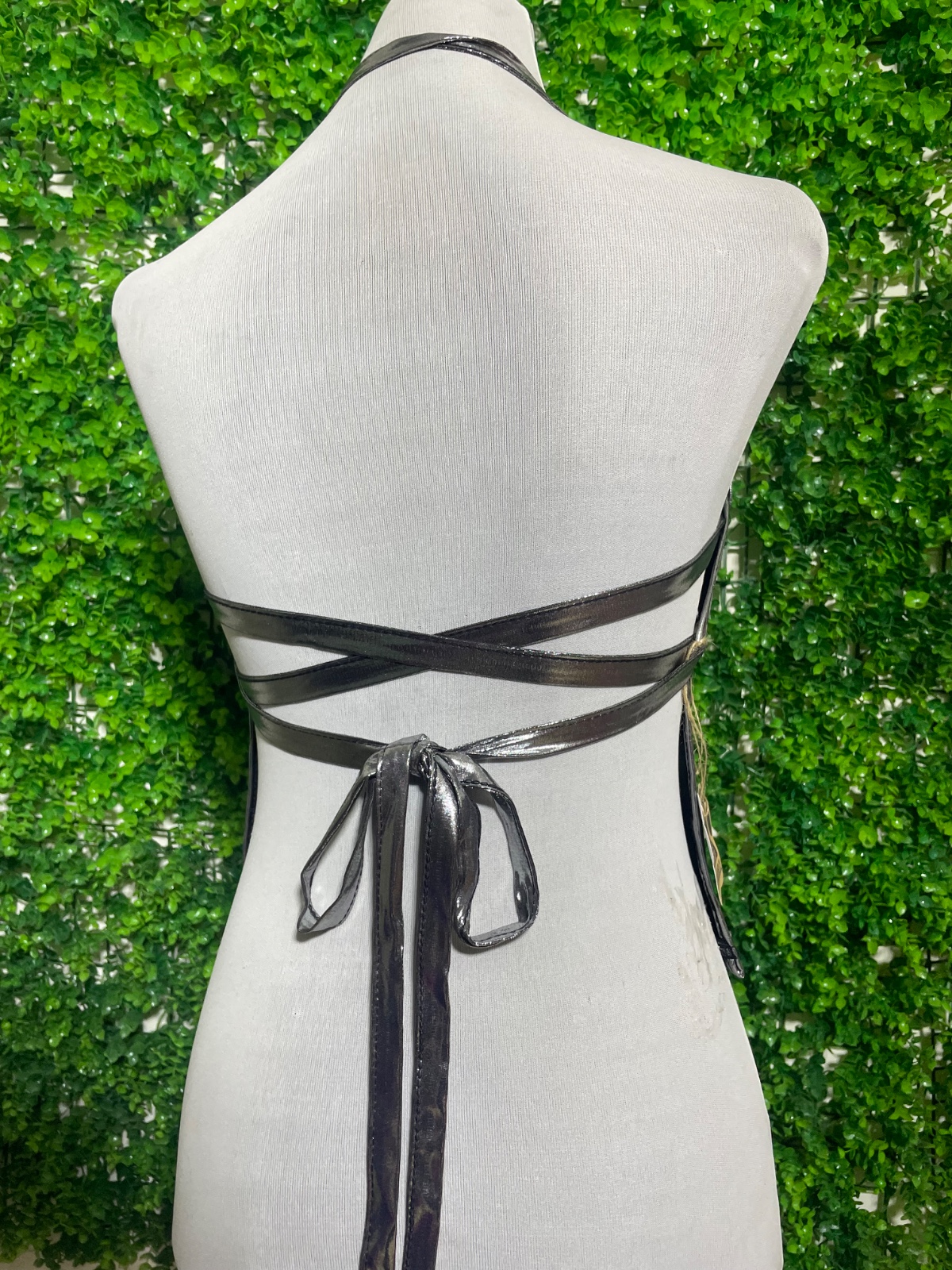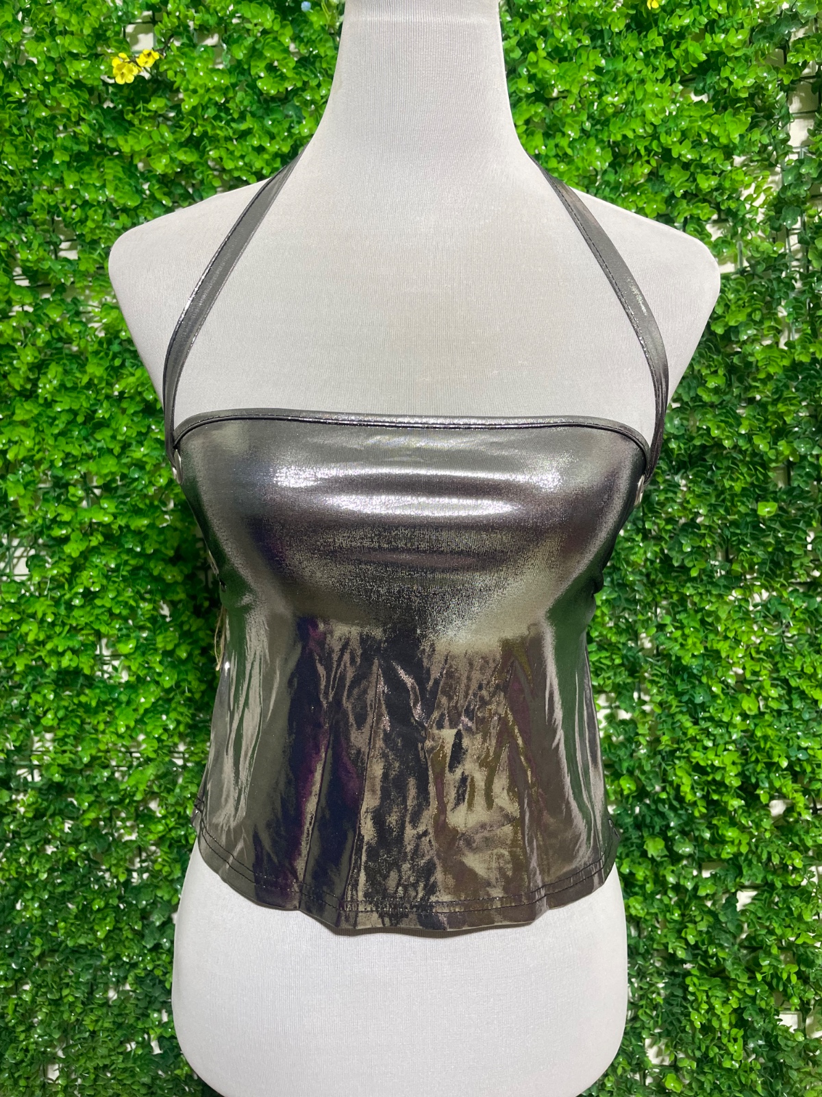 Top textura metalizada, sin espalda.