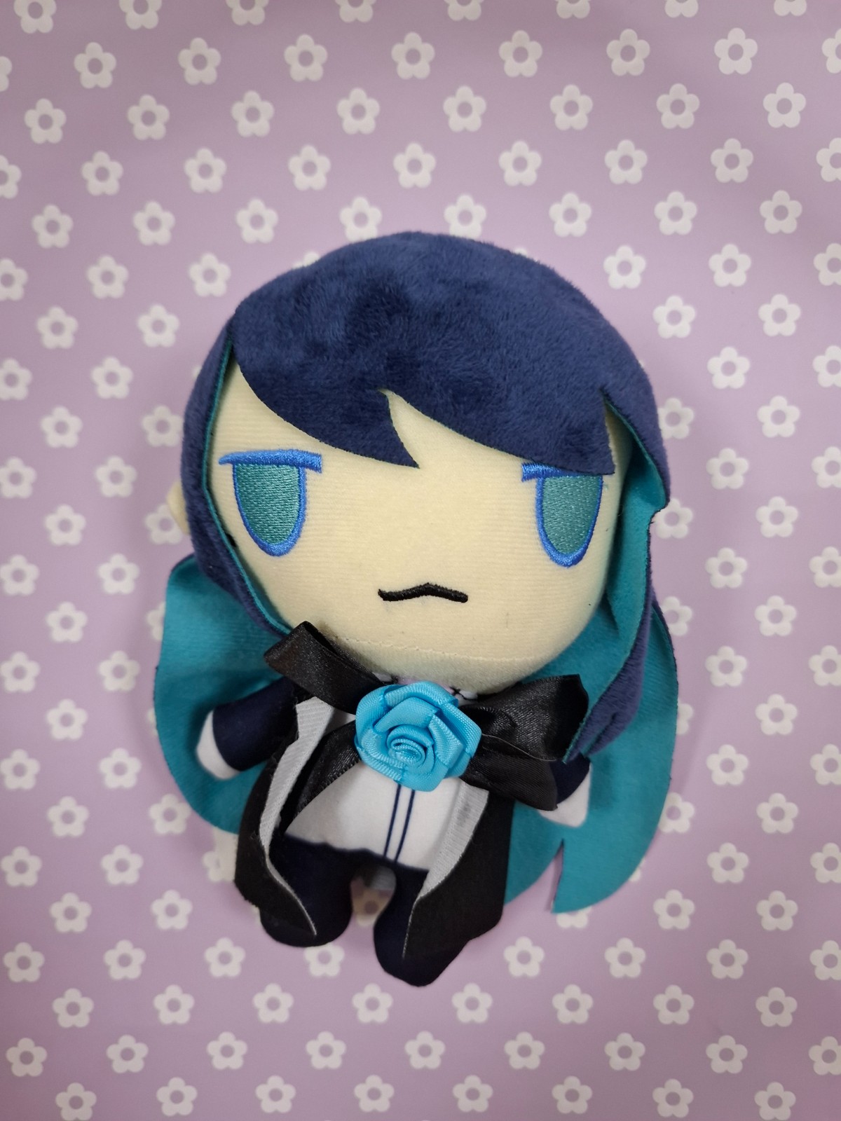 Este peluche mide aproximadamente 18cm y tiene su hermoso oufit de traje con su rosa azul 🌹🦋